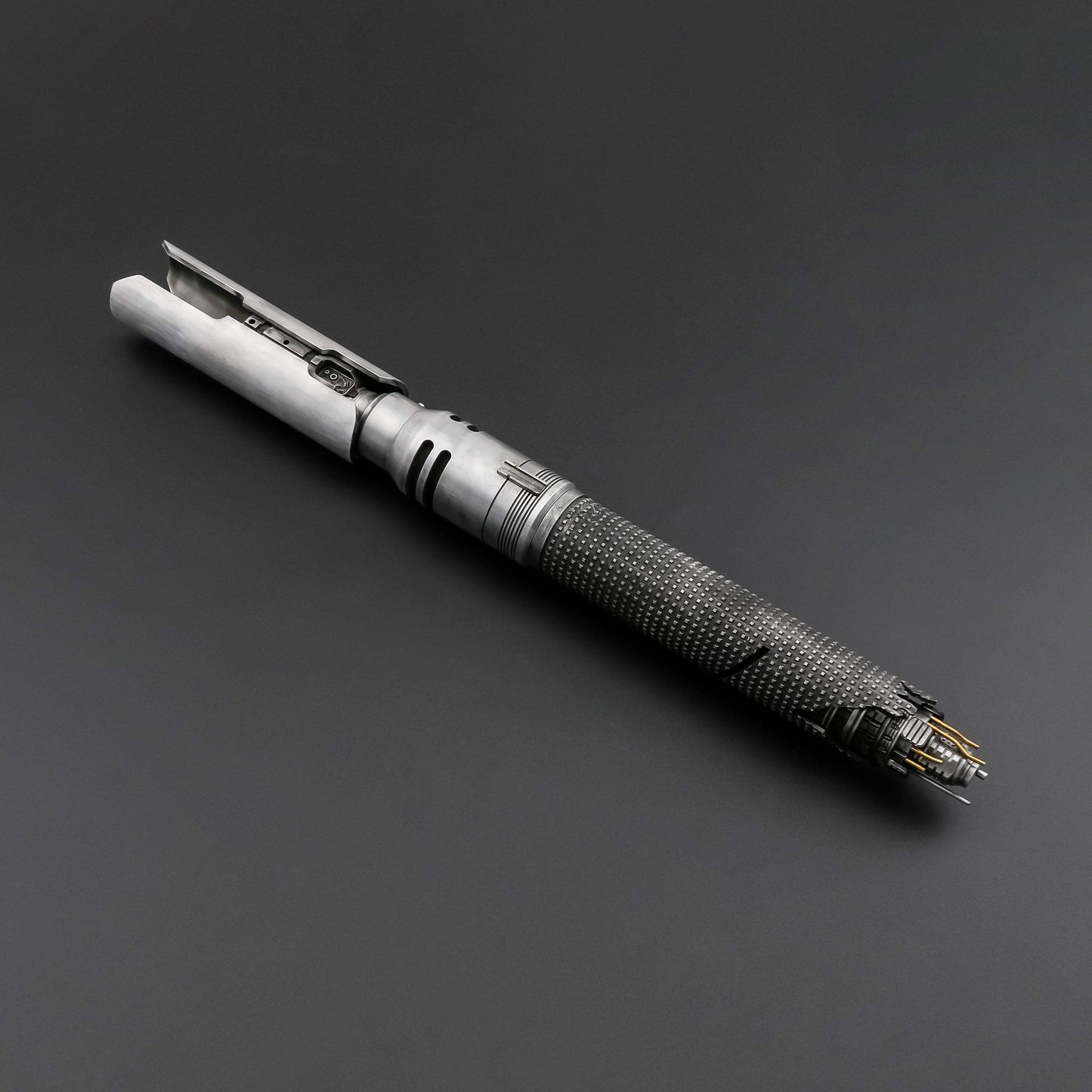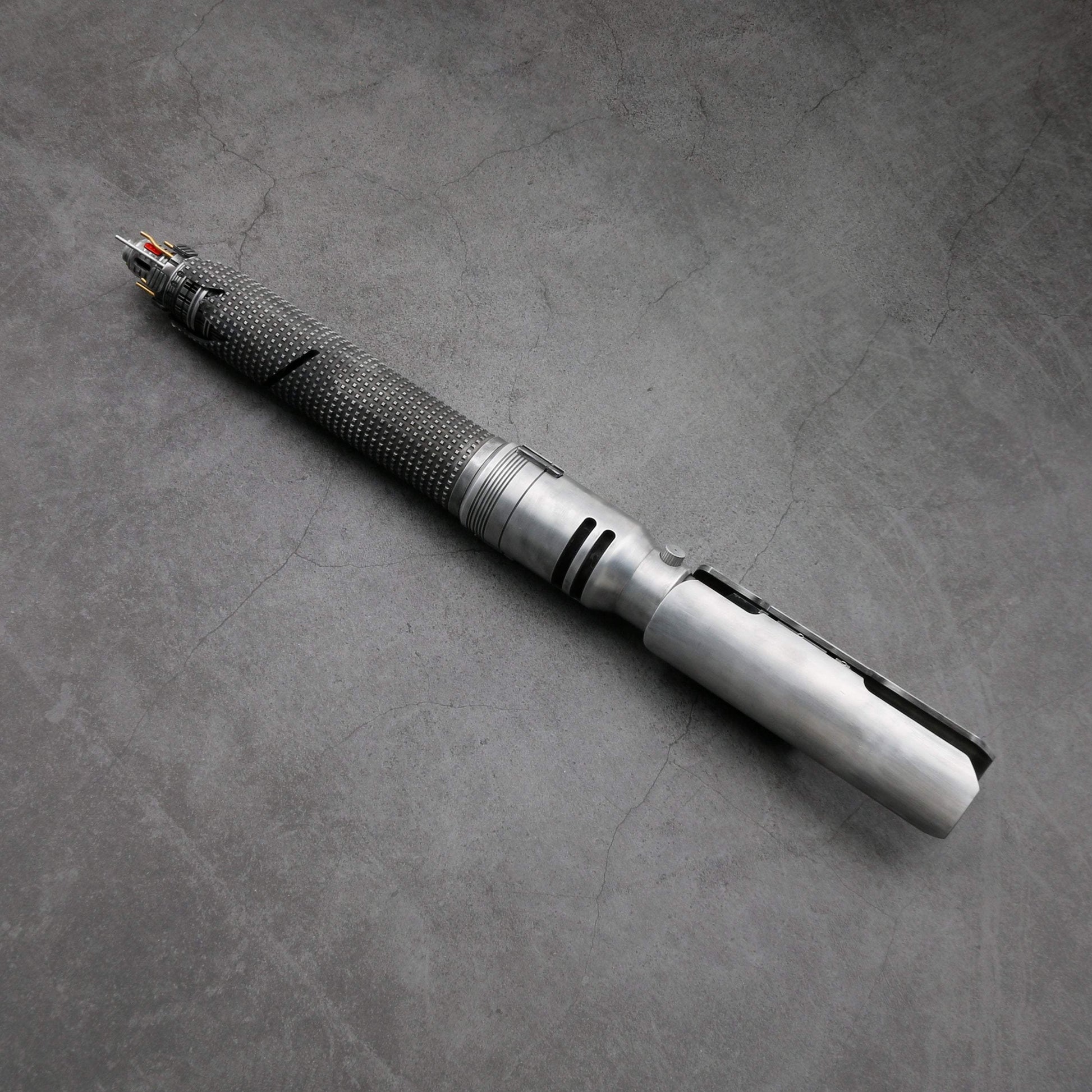 Verwittertes Design : Dieses Lichtschwert verfügt über ein raues, abgenutztes Erscheinungsbild, das die Narben intensiver Kämpfe und Cals unerbittlicher Reise durch die Galaxie hervorhebt.
