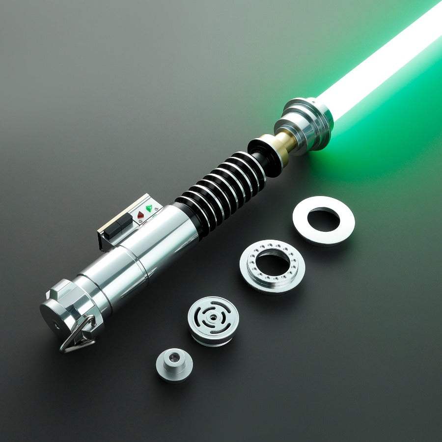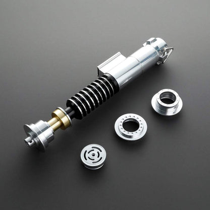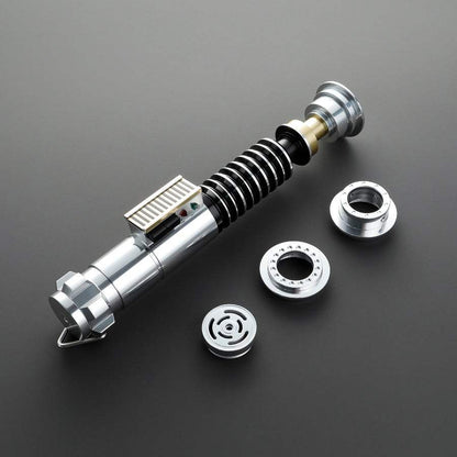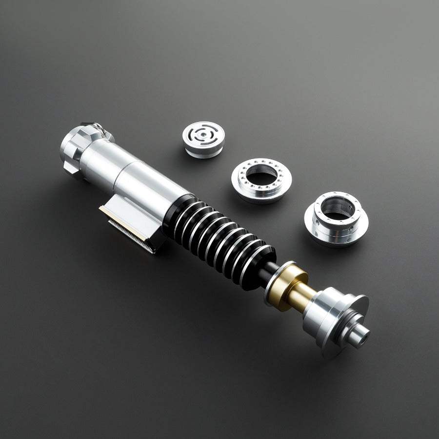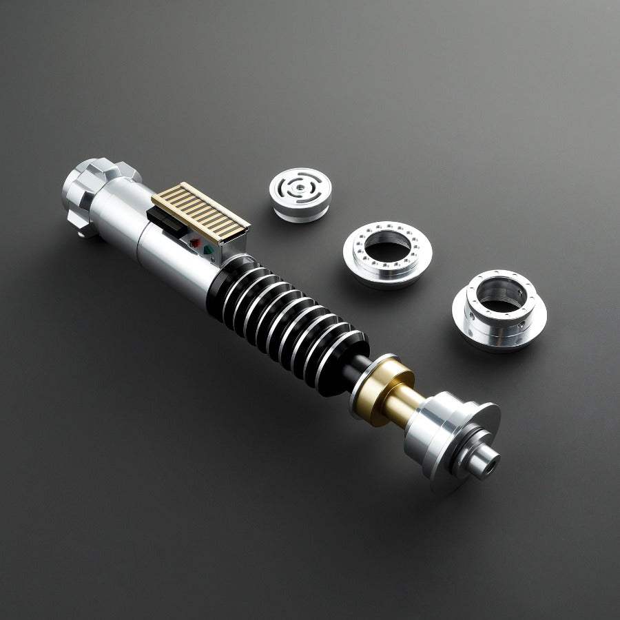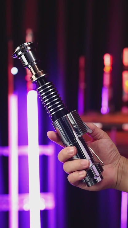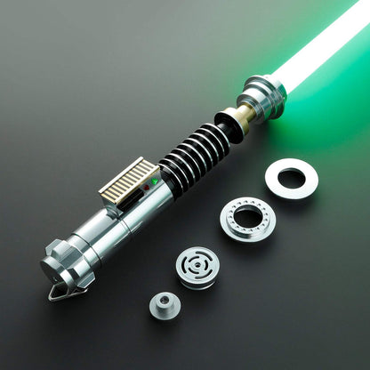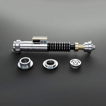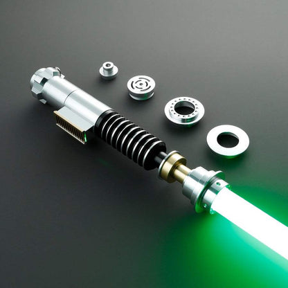 The hilt of this lightsaber is meticulously crafted to match the original design used by Luke Skywalker. Made from high-quality machined aluminum, it features a textured grip and the iconic thin neck emitter, reflecting the practical elegance and heroism of the Jedi. The control box includes functional, illuminated arrows that light up, adding an extra layer of authenticity and enhancing the overall experience.