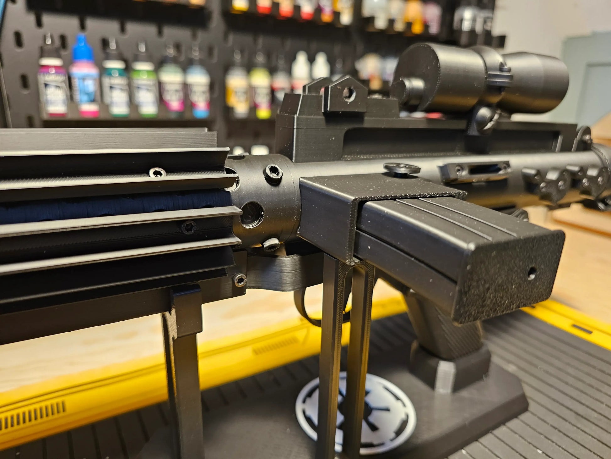 Own a screen-inspired E-11 Stormtrooper blaster prop printed with care and attention to detail. Perfect for collectors, cosplayers, film props, and display enthusiasts, this E-11 replica is produced using high-quality PLA (Polylactic Acid) to deliver crisp detail, a sturdy feel, and reliable dimension stability. The magazine is removable with magnets.